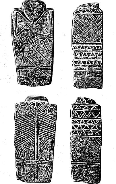 53. Антропоморфні стели із території Франції: 1 — Морель. Департамент Авейрон; 2 — Куржеонне. Департамент Марні; З — Енон. Департамент Сені-і-Уазі. Антропоморфні стели індоєвропейців Як встановили дослідники, семантика поховального комплексу відповідає ідеології, міфології, релігійним уявленням індоєвропейських племен. Від них у середині IV тис. до н.е. відокремились племена аріїв. Частина мігрувала на терени Індії, де осіла на постійно. Однак елементи ідеологічних уявлень аріїв формувалися впродовж тисячоліть і скодифі-ковані у гімнах знаменитого твору праіндоєвропейських аріїв — "Рігведі"*. * "Рігведа" — "Книга гімнів", збірник творів переважно релігійного змісту; остаточно складається наприкінці X ст. до н.е. Найдавніша і найцінніша серед священних книг індуїзму, написаних ведійським санскритом, що дійшли до нашого часу. Всім цим параметрам відповідає і Наталівська стела. Об'ємність цілісної брили каменя дала можливість виділити голову, силует широких плечей, руки, притиснуті до грудей долонями із широко розставленими пальцями. Статуя розділена на дві половини наче поясом. До речі, подібний принцип зображень трапляється і на інших антропоморфних стелах.