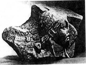 177. Фрагмент рельєфної плити, можливо саркофага, із зображенням голови крилатої богині (ймовірно, Вікторії). Середина II ст. Пам'ятка перевезена 1945 р. із палацу-музею Алупки до Москви. Скульптуру Ольвії вирізняє високий художній рівень. Ольвія за розташуванням найближче межувала зі степовими — кочовими й осілими аграрними племенами. Перші поселенці, котрі за письмовими джерелами заснували місто в VII ст. до н.е., переважно займались рільництвом. Однак Ольвія швидко зміцніла внаслідок торгівлі хлібом, худобою, шкірою, медом, іншими натуральними благами, на які був багатий цей край, стала одним із найвідоміших торговельних, а головне — культурних осередків Північного Причорномор'я, тобто Борисфенідою (місто разом із околицею). Ольвію оточували міцні оборонні мури, тут була чудова архітектура, громадські будівлі, храми, гімнасіони, спортові центри тощо. Особливого поширення набула високого рівня скульптурна пластика. Сьогодні збереглися у музеях тільки рештки пишної колись мистецької величі. Борисфеніти, як називали тоді жителів Ольвії, утворили культурне суспільство, де цінувались твори Гомера, Гесіода, загалом представників високої класики. Це відбилось на творчості митців, прибулих та місцевих, котрі працювали в скульптурних майстернях Ольвії. Як уже зазначалося, збереглась основа скульптури з підписом Праксителя. Не виключено, що в Ольвії, яка дбала про свій культурний престиж, були твори й інших представників античної скульптури. Фрагменти пластик, які збереглись, засвідчують високий рівень творчого середовища і вибагливість замовників. Із IV ст. до н.е. походить шедевральна, але фрагментально збережена двофігурна мармурова композиція із двох жіночих постатей (одна сидить у кріслі, друга стоїть за її спиною). Тут також відчувається пластична досконалість фігур, віртуозне вирішення фрагментів драперій і величавість композиції загалом. Відомі статуетка Афіни (ІУ-ЦІ ст. до н.е.), — вільне повторення знаменитого твору із Акрополя в Афінах, — жіночий портрет (І ст. до н.е., Одеський археологічний музей) — фрагмент якогось великого горельєфа, можливо надгробка, статуетка хлопчика з мішком для вина (III ст. до н.е., С.-Петербург, Ермітаж) та ін. Збереглося багато пам'яток надгробкової, меморіальної скульптури — статуї, бюсти, плити із емблематикою та рельєфи. Деякі мармурові надгробки привозились, інші виконувались із привозного мармуру. Більшість меморіальних надгробків — роботи місцевих скульпторів. Надгробки У-ІУ ст. нагадують надгробкову пластику класичної Греції. Вони суворі та лаконічні, обмежені невеликою кількістю прикрас. Від ІІ~І ст. до н.е. збереглись вузькі високі плити з написами, рельєфними поліхро-мовими зображеннями, рельєфними сценами із життя покійника — жалобні постаті, подружжя за трапезою тощо. Характер надгробних рельєфів особливо змінюється у І ст. н.е. Вони стають розповідними, збільшується кількість сцен персонажів. Зображення поступово переростають у плоскі й схематичні, від чого іноді вигравали декоративність та монументалізм твору. На могилах встановлювалась велика кількість бюстів, фігур, півфігур, груп. Вони мали різний художній рівень, неодноразово із плоскої плити вирізьблювався лише силует людської голови як символ. Такі надгробні "портрети" збереглися в Ольвії. Антична скульптура тут онтологі