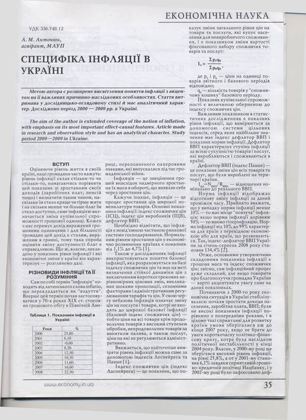 А. М. Антонюк, аспірант, МАУП Інфляція – це знецінення грошей внаслідок зростання їх маси в обороті, що виявляє себе через зростання цін. Основними утворюючими складовими показника інфляції є грошова маса та індекс споживчих цін. Починаючи з 2000-го року економічна ситуація в Україні стабілізувалася: почали зростати доходи населення, заробітна плата, ВВП; були не високі показники інфляції порівняно з попередніми роками, і в цілому такі сприятливі для розвитку країни умови зберігалися аж до кінця 2007 року, якщо не брати до уваги короткочасну політико-фінансову кризу, котра була наслідком політичної нестабільності в у кінці 2004року. Власне, у 2000-му році ще зберігався високий рівень інфляції, на рівні 25,8%, а от у 2001-му становив 6,1% завдяки сприятливій грошово-кредитній політиці Нацбанку,і у 2002-му році було зафіксовано дефляцію на рівні 0,6% до грудня попереднього року. Протягом усього 2008 року економічна ситуація в країні погіршувалася й під кінець року переросла в глибоку кризу. Специфіка інфляції цього періоду цікава тим, що серед причин інфляції переплетені найрізноманітніші фактори, починаючи з зовнішньоекономічних і закінчуючи політичною нестабільністю. Потрібно відмітити,що політична нестабільність внаслідок тісного зв’язку політиків і бізнесу є чи не основною причиною високого рівня інфляції в Україні, так як за власними інтересами важко розгледіти адекватні рішення, спрямовані на соціальний захист населення та його фінансове благополуччя. Не завадило б для пом’якшення економічного спаду застосовувати перевірені на заході засоби, такі як зменшення податкового тиску на мале та середнє підприємництво, розвантаження бюджету країни за рахунок більш забезпечених верств населення, а натомість наша влада лише дозволяє невиправно підвищувати комунальні платежі й піднімає акциз, при цьому не повертаючи ПДВ підприємцям і заганяючи їх у глухий кут. Звісно, на тлі всесвітньої економічної кризи хочеться сприймати з розумінням погіршення експортно-імпортного балансу,падіння виробництва в країні й високі показники інфляції, але не заперечним є факт, що європейські країни в рази легше переживають кризу. Для порівняння за даними Eurostat – за 2008 рік в країнах ЄС інфляція становила 3,7% проти українських 22,3%. Цифри говорять самі за себе, тож залишається лише сподіватися, що українські можновладці знайдуть можливість вирівняти товарно-грошову розбалансованість в країні, поставити інтереси народу на перший план і дати йому можливість гідно жити, а не існувати.