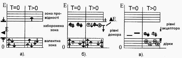 Провідність, виникаюча в результаті переходу електронів з верхніх рівнів валентної зони у зону провідності, називається власною. Якщо до провідника додати домішку, то в забороненій зоні утворюються додаткові енергетичні рівні. Для нас цікаві ті домішки, які розміщуються поблизу зони провідності (донорна домішка) або поблизу валентної зони (акцепторна домішка) (рис. 1 б, в). З підвищенням температури концентрація електронів і дірок провідності зростає відповідно