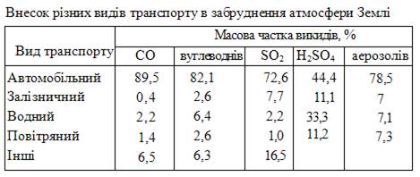 Так, лише один сучасний реактивний пасажирський літак протягом восьмигодинного польоту з Європи в Америку «з´їдає» від 50 до 75 т кисню, викидаючи натомість в атмосферу десятки тонн вуглекислого газу, оксидів азоту та інших шкідливих сполук. Легковий автомобіль «Волга» забирає з повітря кисню в сто разів, а вантажівка ЗИЛ-130 — у 200 разів більше, ніж одна людина. Автомобілі є винуватцями 40 % забруднень атмосфери великих міст, таких як Київ. За даними статистичної служби, в Києві в 1965 р. було 10 автомобілів на тисячу жителів, у 2000 р. — 150. За розрахунками розробників генплану забудови Києва, в 2020 р. на кожну тисячу киян припадатиме 300 автомобілів. Підраховано, що якби всі вихлопні труби автомобілів, котрі «бігають» вулицями Києва, з´єднати в одну, то утворився б жахливий кратер діаметром 25 м, з якого вивергається 110 тис. т шкідливих газів на рік. Становище погіршується ще й тим, що автомобільні викиди концентруються в приземному шарі повітря — саме в зоні нашого дихання. До того ж вітчизняні автомобілі екологічно набагато «брудніші» від багатьох західних моделей: вони витрачають більше палива на 100 км шляху, отож дужче забруднюють повітря. Втім, багато які іномарки, що заполонили наші вулиці, являють собою вже зношені екземпляри, двигуни яких спрацьовані й тому сильно забруднюють повітря. До цього часу в нас використовується переважно вкрай шкідливий етильований бензин, який забруднює повітря свинцем. Двигуни автомобілів часто бувають погано відрегульованими, тому в їхніх вихлопних газах міститься багато СО, сажі тощо. Мережа автомобільних доріг і залізниць займає великі площі землі, яку можна було б використати раціональніше, скажімо, для вирощування сільськогосподарських культур або лісу. Так, для прокладання навіть найпростішої дороги завширшки 4 м на кожні 2,5 км траси треба вирубати 1 га лісу! А що вже казати про сучасні шестисмугові швидкісні хайвеї. Дорожні насипи часто є причиною підтоплення ґрунтовими водами й заболочування прилеглих ділянок. На дорогах гине багато диких тварин, які потрапляють під колеса машин, птахів, що зіштовхуються з ними в польоті. Водне середовище дуже забруднюють великотоннажні вантажні судна, особливо нафтові танкери. Аварії таких танкерів уже призводили не до однієї екологічної катастрофи — згадаймо аварії танкерів «Амоко кадіс» біля узбережжя Франції (1978 р.) чи «Екссон валдіз» поблизу узбережжя Аляски (1990 р.). Зростання обсягів перекачування нафти, нафтопродуктів, природного газу тощо системами трубопровідного транспорту пов´язане зі збільшенням діаметра труб і застосуванням дедалі більших тисків при перекачуванні, що загрожує великомасштабними аваріями (приклади — вибух бензопроводу в Челябінській області в 1995 р. чи забруднення величезної площі земель нафтою, яка витекла з пошкодженого нафтопроводу в республіці Комі на півночі Росії в 1994 р.). Негативно впливають на озоновий шар атмосфери висотні польоти літаків, запуски космічних кораблів і військових балістичних ракет. Підраховано, що в результаті 100 запусків поспіль космічного корабля «Спейс Шаттл» майже вщент зруйнувався б захисний озоновий шар Землі. Не можна не згадати про посилення негативного впливу на довкілля ще одного виду транспорту — трубопровідного. Лінії потужних сталевих трубопроводів, які транспортують газ, нафту, амі