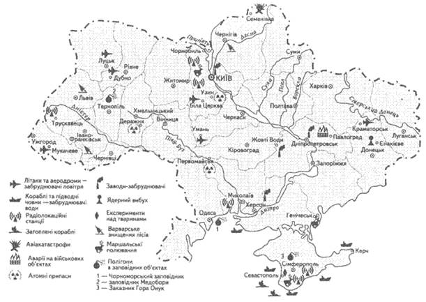 Об´єкти потенційної ядерної та радіаційної небезпеки в Україні. Військова діяльність була й залишається джерелом небезпеки для природи (рис. 7. 5). Воєнно-промисловий комплекс (ВПК) споживає величезну кількість мінеральної сировини та енергії, потрібних для виробництва військової техніки. Армія і флот спалюють у двигунах літаків, танків, автомобілів, кораблів, у котельнях військових містечок і частин колосальні об´єми палива. Площа земель під полігонами, стрільбищами,.мисливськими господарствами для вищих чинів, навчальними центрами перевищує 100 тис. га. На утримання армії, флоту, підприємств ВПК витрачається чимала частина коштів національного бюджету України. Величезної шкоди завдають природі випробування різних видів озброєнь, а також проведення маневрів і навчань.