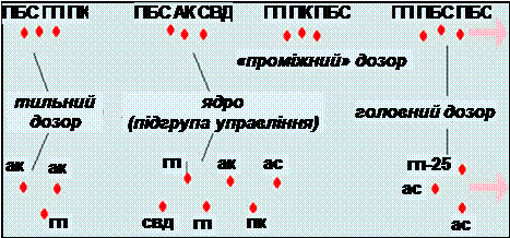Бойовий порядок "лінія" застосовується для точного планомірного огляду місцевості, висування групи (підгрупи) на вогневий рубіж, при фронтальній загрозі противника й т.д. Рух у лінію може здійснюватися всією групою одночасно, частиною групи при її безпосередній вогневій підтримці спеціально виділеними розвідниками (див. малюнок) або послідовним переміщенням окремих розвідників, пар і розрахунків-трійок. При послідовному переміщенні використовується принцип коротких перебіжок з постійним вирівнюванням лінії, але особовий склад групи пересувається кроком зі звичайної для ведення розвідки швидкістю. ВАРІАНТИ ПОБУДОВИ БОЙОВОГО ПОРЯДКУ ДОЗОРУ (СХЕМА)? Виділенні від групи дозори (розвідувальні, головний, тильний або бічні) пересуваються на віддаленні зорового зв'язку й вогневої підтримки стрілецької зброї. Бойовий порядок дозору повинен забезпечувати можливість кругового спостереження й ведення вогню. Основне завдання дозору - своєчасне виявлення противника.