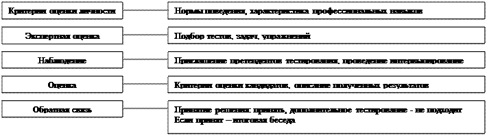 Наиболее часто применяются личностные опросники. 3. Собеседование (интервью). К интервью обычно допускается 20-30% от общего числа кандидатов, оставшихся в процессе предварительного отбора. В рекомендациях по оцениванию кандидатов с помощью собеседования используется следующая классификация: первое впечатление и физический облик; уровень квалификации; интеллект и способности; мотивированность к труду; жизненные обстоятельства. Собеседование представляет собой активный обмен информацией между представителем организации и кандидатом на замещение вакантной должности. Его цель - оценка профессионально важных действий и личных качеств кандидата, таких как профессиональные знания и опыт работы, целеустремленность и ответственность, степень объективности и самокритики, стремление к лидерству, умение говорить и слушать. Оно позволяет оценить широкий круг качеств, необходимых для работы по предлагаемой вакансии: профессионализм, культурный уровень, ценностные ориентации и мотивацию кандидата. Собеседованиеможет принимать один из трех видов: беседы по схеме со стандартным списком вопросов (и ожидаемых ответов); слабо формализованная беседа, которая предусматривает только круг основных вопросов; беседа не по схеме. Необходимость использования комплекса различных методов при отборе связана с тем, что ни один из них по отдельности не дает исчерпывающей информации, на основании которой можно было бы принять верное решение о приеме на работу. Только дополняя результаты, полученные с помощью одного метода, данными, собранными с помощью других методов, можно рассчитывать на то, что отобранные работники будут максимально соответствовать установленным критериям отбора и полностью устраивать организацию. Но и это не дает полной гарантии, в связи, с чем многие организации при приеме новых работников устанавливают испытательный срок. СХЕМА ОТБОРА ПЕРСОНАЛА