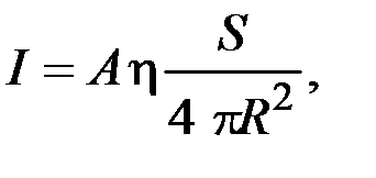 де R – відстань від джерела до лічильника. Співвідношення (7.1.5) визначає інтенсивність випромінювання у точці на відстані R від джерела і називається законом обернених квадратів. Із співвідношення (7.1.5) видно, що графіком залежності