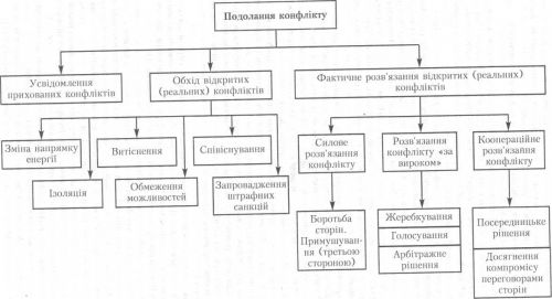 Під поняттям „функції конфлікту” ми будемо розуміти ту роль, яку виконує конфлікт по відношенні до суспільства і його різних структур (організацій, окремих людей, соціальних груп). Вчені розрізняють явні і скриті (латентні) функції конфлікту. З точки зору функцій, конфлікт є досить протирічиве явище. Часто важко передбачити навіть не дуже далекі перспективи і наслідки конфлікту. Наприклад: робітник, який вступав в конфліктні відносини з адміністрацією, добився своєї найближчої мети – виплати компенсації за вимушений прогул. Але через деякий час його звільнили з роботи під якимось іншим мотивом. Для звільненого співробітника це скоріше за все буде латентна функція конфлікту і при цьому негативна. Але пізніше він влаштувався на більш привабливу та високооплачуєму роботу. тоді це буде позитивна латентна функція. В такому випадку говорять „не було би щастя, та нещастя помогло”. Таким чином явні і латентні функції конфлікту мають як позитивну так і негативну сторони, тобто носять двоякий характер. Подолання відкритих (реальних) конфліктів іноді здійснюється за допомогою т. зв. обходу конфлікту, до якого вдаються тоді, коли успішне розв´язання його неможливе. Такий спосіб передбачає використання певних заходів, а саме: • ізоляцію, «розведення» сторін — коли один чи кілька учасників конфлікту ізолюються, через що в них зникає необхідність у контактуванні (наприклад, переведення когось із працівників в іншу організацію); • обмеження можливостей — коли одного чи кількох учасників конфлікту позбавляють влади, яка необхідна для реалізації власних інтересів (наприклад, коли керівника певного підрозділу звільняють з посади); • запровадження штрафних санкцій — коли в результаті застосування адміністративних санкцій, реальних чи можливих, сторони змушені припинити конфлікт (наприклад, на конфліктуючих працівників може позитивно вплинути попередження керівника підрозділу про винесення догани обом за некоректну поведінку); • зміну напрямку енергії — коли енергія учасників конфлікту спрямовується в інший бік або для виконання спільних завдань, або для подолання зовнішніх «ворогів» (наприклад, доручення сторонам конфлікту підготувати презентацію діяльності підрозділу на спільних зборах усієї організації); • витіснення — коли конфлікти ігноруються, заперечуються або замовчуються авторитетними людьми, які формують громадську думку в колективі, або самими учасниками суперечностей, сподіваючись, що напружена ситуація з часом зникне (наприклад, під час конфлікту між двома керівниками підрозділів, зумовленого особливостями їх характеру, керівник організації не зважає па це, сподіваючись, що конфлікт зникне сам по собі); • співіснування — мовчазна відмова учасників конфлікту від постійного розпалювання ворожнечі, коли сторони усвідомлюють пріоритет загальних цілей та інтересів або толерантно ставляться один до одного. Отже, варто наголосити, що обхід конфлікту стає можливим лише завдяки активному впливові керівника на об´єктивну конфліктну ситуацію. Фактичне розв´язання конфлікту — це ліквідація відкритого спору в результаті врахування або реалізації інтересів однієї чи обох сторін конфлікту.