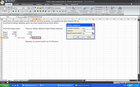 Нехай клієнт хоче взяти кредит на суму 10000 грн. на 2 роки за умовою, що щомісячно він буде погашати 500 грн. За допомогою підбору параметру оцініть під скільки процентів він це зможе зробити. Постановка прямої задачі