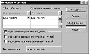 Рис. 5.6. Вікно зміни властивостей зв’язку При введенні даних та внесенні змін до таблиць існує необхідність підтримувати цілісність (несуперечливість) даних. Умовами цілісності даних називають набір правил, які використовуються для підтримки між табличних зв’язків та заборони на випадкове поновлення або знищення пов’язаних таблиць. Встановлення прапорця „Обеспечение целостности данных" дозволяє забезпечити виконання цих умов, а саме · додавати запис у підпорядковану таблицю (зі сторони „багато”) можна лише при наявності відповідного запису у головній таблиці; · заборонено видаляти запис з головної таблиці, якщо у підпорядкованій таблиці є відповідний запис. У випадку введення даних, що порушують цілісність даних, буде видано повідомлення. Пом’якшити правила зміни та видалення записів у пов’язаних таблицях, якшо встановити прапорці "Каскадное обновление связанных полей" та "Каскадное удаление связанных записей", а саме · встановлення прапорця "Каскадное обновление связанных полей" включає режим автоматичної зміни пов’язаних записів у підпорядкованій таблиці при зміні значень первинного ключа у головній таблиці; · встановлення прапорця "Каскадное удаление связанных записей" включає режим автоматичного видалення пов’язаних записів з підпорядкованої таблиці при видаленні значення первинного ключа з головної таблиці.