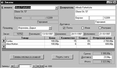 ФІЛЬТРАЦІЯ ЗАПИСІВ ЗА ДОПОМОГОЮ ФОРМ За допомогою форм можна здійснювати фільтрацію (відбір) даних за визначеною умовою та зберігати фільтр у вигляді запитів. Після застосування фільтру у формі відображаються лише дані, які задовольняють визначеним умовам. Фільтр можна створити двома способами: 1. за виділеним значенням одного з полів (фильтр по выделенному); 2. за складеною умовою відбору записів. Для створення фільтру за виділеним значенням необхідно виконати такі дії: · відкрити форму в режимі даних (режим формы); · розмістити курсор у поле зі значенням, за яким буде здійснено фільтрацію; · натиснути кнопку «Фильтр по выделенному» панелі інструментів „Режим формы”; · переглянути відібрані записи за допомогою кнопок переходу по записах; · зняти фільтр за допомогою кнопки «Удалить фильтр» панелі інструментів „Режим формы”. Для відбору записів за складеною умовою необхідно виконати такі дії: · відкрити форму в режимі даних (режим формы); · натиснути кнопку «Изменить фильтр» панелі інструментів „Режим формы”; · сформувати умови відбору записів; · натиснути кнопку «Применение фильтра» панелі інструментів „Режим формы”; · переглянути відібрані записи за допомогою кнопок переходу по записах; · зняти фільтр за допомогою кнопки «Удалить фильтр» панелі інструментів „Режим формы”. Складена умова містить прості умови, які об’єднані за допомогою логічних зв’язок «И» та «ИЛИ». Після натиснення на кнопку «Изменить фильтр» внизу форми з’являються вкладки. На кожній з цих вкладинок визначаються умови на значення атрибутів. Причому умови, що розташовані на одній вкладниці, об’єднуються за допомогою логічної зв’язки «И», а умови, що розташовані на різних вкладинках, об’єднуються за допомогою логічної зв’язки «ИЛИ». Результати фільтрації можуть бути експортовані у файл Excel. Для цього необхідно виконати команду Сервис ® Связи с Office ® Анализ в MS Excel. Фільтр можна зберігти у вигляді запиту за допомогою кнопки Сохранить как запрос панелі інструментів Фильтр у режимі зміни фільтру. Підпорядкована форма – це форма, яка пов’язана з іншою (головною) формою за деякою сукупністю полей. Підпорядковані форми використовуються для представлення даних таблиць та запитів, які пов’язані відношенням “один до багатьох”, причому головна форма представляє сторону “один”, а підпорядкована форма - сторону “багато”. Відображення даних у підпорядкованій формі синхронизується з головною формою таким чином, що у підпорядкованій формі відображаються тільки ті записи, які пов’язані з поточним записом головної форми. На рис.5.7 зображено форму бази даних «Борей», яка містить підпорядковану форму.