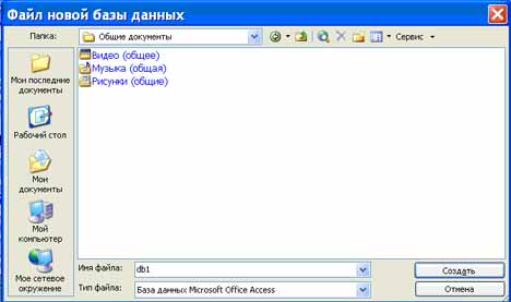 При виборі команди «Нова база даних» відкриється вікно діалогу «Файл нової бази даних», в якому необхідно вибрати ім'я диска і директорії для зберігання БД, а також ім'я БД (тип файлу встановлюється за замовчуванням «Бази даних Microsoft Office Access») і клацнути на кнопці «Створити», буде збережений файл з розширенням.mdb.