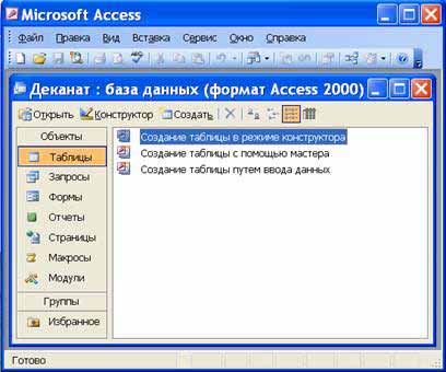 У головному вікні з'явиться вікно БД з призначеним ім'ям, наприклад «Деканат: база даних (формат Access 2000). У Access2003 для нових баз даних за замовчуванням використовується формат файлу Access 2000, необхідний для забезпечення сумісності з базами даних попередніх версій. Для того, щоб змінити формат файлів Access 2000, необхідно в меню головного вікна вибрати команду «Сервіс / Службові програми / Перетворити базу даних» і вказати потрібний формат.