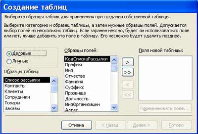При виборі режиму Майстер таблиць відкриється вікно «Створення таблиць», в якому за допомогою зразків таблиць і полів легко сформувати поля нової таблиці.