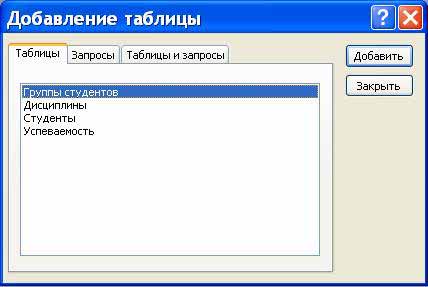 У діалоговому вікні Додавання таблиць, що з'явилося, необхідно виділити імена таблиць і натиснути кнопку Додати, при цьому у вікні "Схема даних" додаються таблиці. Після появи всіх таблиць у вікні Схема даних необхідно закрити вікно Додавання таблиці, клацнувши лівою кнопкою миші на кнопці Закрити.
