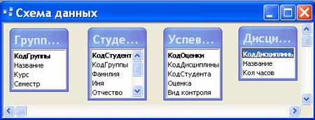У вікні Схема документа з'явиться зв'язок один-до-багатьох між таблицями Групи студентів і Студенти. Аналогічним чином треба зв'язати поля Кодстудента в таблицях Студенти і Успішність, а потім поля Коддисципліни в таблицях Успішність і Дисципліни. У результаті отримаємо Схему даних, зображену на малюнку.