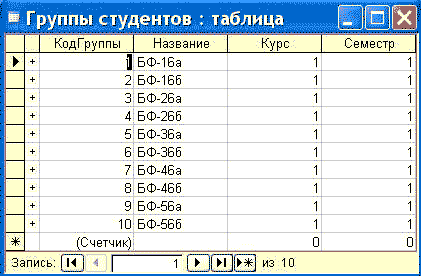 Після встановлення зв'язків між таблицями вікно Схема даних необхідно закрити. Далі необхідно здійснити заповнення всіх таблиць. Заповнення таблиць доцільно починати з таблиці Групи студентів, оскільки поле Кодгрупи таблиці Студенти використовується як стовпець підстановки для заповнення відповідного поля таблиці Студенти. Заповнення таблиць