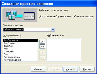 Запит (query) – це засіб вибору необхідної інформації з бази даних. Питання, сформоване для пошуку даних з бази даних, і є запитом. Застосовуються два типи запитів: за зразком (QBE – Query by example) і структурована мова запитів (SQL – Structured Query Language). QBE - запит за зразком – засіб для відшукання необхідної інформації в базі даних. Він формується не на спеціальній мові, а шляхом заповнення бланка запиту у вікні Конструктора запитів. SQL – запити – це запити, які складаються (програмістами) з послідовності SQL – інструкцій. Ці інструкції задають необхідні дії з вхідним набором даних для генерації вихідного набору. Всі запити Access будує на основі SQL – запитів. Щоб переглянути їх, необхідно в активному вікні проектування запиту виконати команду Вид/sql. Існує декілька типів запитів: на вибірку, на оновлення, на додавання, на видалення, перехресний запит, створення таблиць. Найбільш поширеним є запит на вибірку. 2.4.4.1. Створення запиту на вибірку за допомогою Майстра При створенні запиту (query) необхідно визначити: · Поля в базі даних, за якими йтиме пошук інформації · Предмет пошуку в базі даних · Перелік полів внаслідок виконання запиту У вікні база даних вибрати вкладку Запити і двічі клацнути на піктограмі Створення запиту за допомогою майстра, з'явиться вікно Створення простих запитів.
