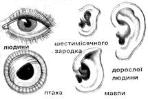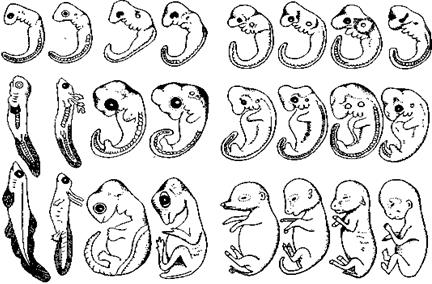 Рис. 11.2. Гомологічні органи. Гомологія кінцівок чотириногих, встановлена на основі гомотопії. А. Основний план будови кінцівки чотириногого. Б-Д. Тварини із земноводним або наземним способом життя: Б – саламандра, В – крокодил, Г – кріт, Д – свиня. Е-З. Плаваючі тварини: Е – морська черепаха, Ж – пінгвін, 3 – кит. И-Л. Літаючі тварини: И – літаючий ящір, К – птах, Л – кажан Інші свідчення на користь еволюції, теж засновані, в остаточному підсумку, на принципі гомології, можна знайти в процесах ембріонального розвитку, як це сформулював Е.Гекель у своєму біогенетичному законі (рис. 11.3): онтогенез у скороченому виді повторює деякі фази, пройдені даною групою організмів у філогенезі. Крім того, цінні відомості може дати наявність рудиментарних (залишкових, недорозвинених) органів або поява атавізмів (повернення до вже втрачених ознак), що нагадують ознаки предкової форми (рис. 11.4).