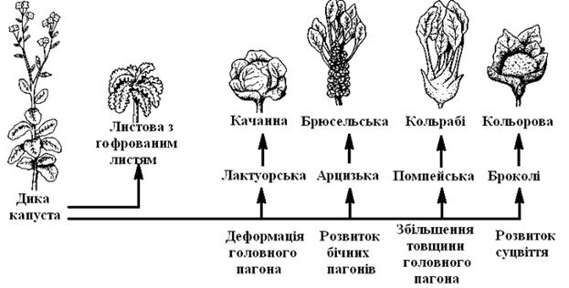 де А и В –порівнювані види. Величині SAb відповідає на схемі положення самої нижньої горизонтальної лінії, що з'єднує обидва види. При SAb = 1,0 збіг був би повним. Про значення сприятливих мутацій часто можна судити за порівняно швидким поширенням їхніх носіїв, особливо у тому випадку, якщо вони добре пристосовані до умов, що змінилися. У березового п'ядака (Biston betularia) крім світлої нормальної форми зустрічається темний мутант (саrbonaria). Ці дві форми розрізняються алелями одного гена і у разі схрещування дають менделівське розщеплення. В Англії у областях із сильним задимленням атмосфери переважає мутантна форма, а в районах з чистішим повітрям – нормальна, тобто в кожному випадку та, котра менш помітна для ворогів. Одна або кілька генних мутацій, як правило, приводять лише до внутрішньовидової еволюції. Границі виду долаються тільки у результаті численних (або особливо важливих) мутацій, якщо виникаюча при цьому нова форма ізолюється від вихідного виду репродуктивними бар'єрами. У процесі еволюції відбувалися великі зміни числа хромосом. У сучасних організмів на один геном доводиться від 1 до 500 і більше хромосом. Їх число часто буває поліплоїдним або анеуплоїдним. Поліпоїди становлять 30-50% всіх квіткових рослин (це в більшості випадків алополіпоїди). Після поліплоїдізації в результаті неправильного розходження хромосом може відбутися анеуплоідизація. У ході еволюції відбувся величезний ріст кількості ДНК у геномі: у бактерій один геном містить 106-107 пар нуклеотидів, у ссавців – близько 5-109. Однак у вищих організмів близько 30% ДНК повторюється, у бактерій же повторюваної ДНК усього лише близько 0,3%. Схрещування – набагато більш часті події, ніж мутації, особливо у видів з перехресним заплідненням. Приводячи до рекомбінації генів, вони значно підвищують різноманіття форм усередині виду. 11.2.3 Напрямні фактори Вихідним матеріалом для всякої еволюції служать генетичні варіанти. Генетичні зміни самі по собі позбавлені доцільності, вони відбуваються у всіляких напрямках. Зіштовхуючись із різноманітними внутрішніми (морфологічними і функціональними) і зовнішніми (навколишнє середовище) умовами, змінені особини одержують різні шанси передати потомству свою змінену генетичну інформацію і цим вплинути на частоту певних алелей у популяції. Цей принцип називають принципом добору; це статистичний процес. Слова Дарвіна щодо добору як «виживанні найбільш пристосованих» і про «боротьбу за існування» нерідко розумілися невірно – як «боротьба всіх проти всіх». Селективна цінність (ступінь адаптивності, пристосованість) генотипу визначається його реакцією на тиск добору, тобто суму всіх діючих селективних факторів. Ступінь їхнього впливу вимірюють коефіцієнтом добору s. При повній елімінації (потомства немає) s =1; якщо ж частота алеля не зменшується (у добре пристосованих форм), s =0. Процеси добору піддаються математичному аналізу й моделюванню. Добір, впливаючи в основному на особини, робить у генному фонді спрямовану зміну, що у ряді поколінь (гологенії) викликає підвищення пристосованості. Цю можливість спрямованого добору використовує і людина у формі штучного добору в тваринництві та рослинництві; вона заснована на разючій мінливості видів (рис. 11.5).
