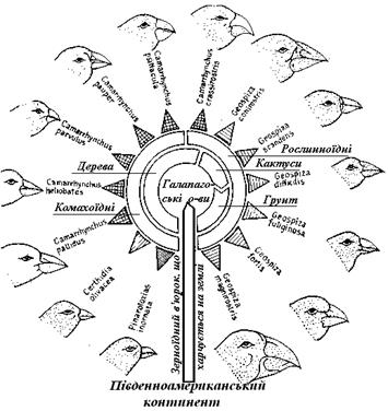 Рис. 11.6. Адаптивна радіація:Дарвінові в'юрки на Галапагоських островах