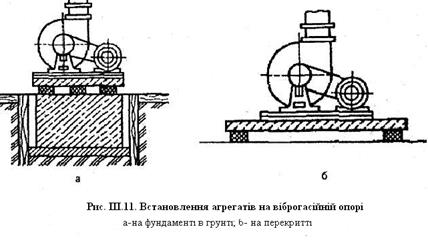 Основні нормовані параметри вібрації – середньоквадратичні величини Lv(дБ) рівнів віброшвидкості (віброприскорення або віброзміщення) в октавних смугах з середньогеометричними значеннями частот 2; 4; 8; 16; 31,5 і 63 Гц, виражені у вигляді: Lv = 201g(V/V0); де V – середньоквадратична віброшвидкість, м/с; Vo – гранична віброшвидкість, що дорівнює 5 108 м/с. Граничні величини віброприскорення і віброзміщення відповідно дорівнюють 3 . 10-4м/с і 8 . 10-12 м/с. Встановлено гранично допустимі величини вібрації. Вони визначені із розрахунку, що, систематично діючи протягом 8-годинного робочого дня, вібрація не викликає у робітника захворювань або відхилень у стані здоров'я протягом усього періоду його виробничої діяльності. Для зниження впливу вібрацій на навколишнє середовище необхідно вживати заходів щодо їхнього зниження насамперед у джерелі виникнення або, якщо це неможливо, на шляхах поширення. Зниження вібрацій у джерелі проводиться, як на етапі проектування, так і при експлуатації. Причиною низькочастотних вібрацій насосів, компресорів, двигунів є дисбаланс обертових елементів (роторів), викликаний неоднорідністю матеріалу конструкції (ливарні раковини, жужільні домішки) і нерівномірністю його густини, несиметричним розподілом обертових мас (початкове викривлення валів і роторів), порушенням зазначеної симетрії кріпильними з'єднаннями, неправильним вибором допусків на обробку і типу посадок, а також різницею коефіцієнтів об'ємного розширення або зносостійкості окремих елементів обертової системи. В усіх випадках зсув центру мас щодо осі обертання призводить до виникнення незрівноваженої відцентрової сили: F = mew 2 де m – маса обертової системи; w - кутова швидкість обертання; е – ексцентриситет центру аналізованої маси щодо осі ротора. Дія незрівноважених динамічних сил збільшується незадовільним кріпленням деталей, їхнім зносом у процесі експлуатації. Для зниження рівня вібрацій, що виникають через дисбаланс устаткування при монтажі й експлуатації, повинно застосовуватися балансування незрівноважених роторів, коліс, лопаткових машин, валів двигунів та ін. У процесі експлуатації технологічного устаткування повинні застосовуватися заходи щодо усунення зайвих люфтів і зазорів, що забезпечується періодичним оглядом джерел вібрації машин і механізмів. Ефективним є також метод зниження вібрації в джерелі виникнення – уникнення резонансних режимів роботи устаткування. Для зниження рівня виробничих вібрацій важливо виключити резонансні режими роботи технологічного устаткування. Якщо не вдається знизити вібрації в джерелі виникнення, то застосовують методи зниження вібрацій на шляхах поширення – віброгасіння, віброізоляція або вібродемпферування. Віброгасіння. Використання цього методу пов'язане зі збільшенням реактивної частини імпеданса коливної системи. Віброгасіння реалізується при збільшенні ефективної жорсткості і маси корпуса машин або станин верстатів за рахунок їхнього об'єднання в єдину замкнену систему з фундаментом за допомогою анкерних болтів або цементної підливки. 3 цією ж метою малогабаритне інженерне устаткування житлових будинків (вентилятори, насоси) встановлюють на опорні плити і віброгасні основи (рис. 3.12). Коливання зварних фундаментів у 2 рази нижчі, ніж стрічкових.