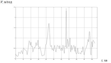 Рисунок 2.1. Графік зміни механічної швидкості V (t) в часі Як видно з графіка V (t), механічна швидкість має стохастичний характер. Для знаходження математичного сподівання Мv, дисперсії Дv і автокореляційної функції R vv(τ) провели дискретизацію графіка V (t) з кроком дискретизації Δ t = 0,84 с і скористались стандартними функціями програмного продукту Matlab6,5 у вигляді: М 1 = mean (T) – математичне сподівання; Д 1 = (S 1)^2 – дисперсія; S 1 = std (T) – середньоквадратичне відхидення. Отримано такі результати: Мv =0,5468 м/год; Дv = 0,1142 м2/год2; Sv = 0,3379 м/год. Для визначення автокореляційної функції і спектральної густини скористаємось формулами:
