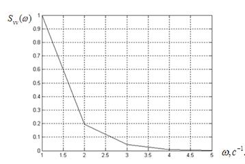 Рисунок 2.3. Графік нормованих значень спектральної густини механічної швидкості Svv (ω) Аналогічні графіки автокореляційних функцій R vv(τ) отримані при різних значеннях початкової механічної швидкості: Мv = 20 м/год., Мv = 7 м/год., Мv = 1 м/год. Встановлено, що параметри отриманих нормованих автокореляційних функцій залежать від середніх значень механічної швидкості, що зв’язано з нестаціонарністю функції швидкості буріння V (t). Із збільшенням середнього значення швидкості збільшується дисперсія Дvv=R vv(0), але зменшується інтервал кореляції τо. Значення параметрів апроксимуючого виразу