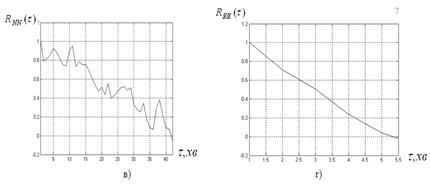 Рисунок 2.5. Графіки нормованих автокореляційних функцій а) сигналу P (t) – Rpp (τ); б) сигналу І (t) – Rіі (τ); в) сигналу N (t) – RNN (τ); г) сигналу Е (t) – RЕЕ (τ).