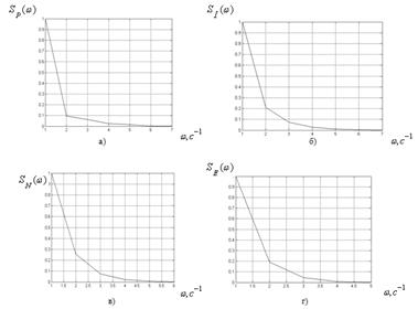 Рисунок 2.6. Графіки нормованих значень спектральних густин: а) сигналу P (t); б) сигналу І (t); в) сигналу N (t); г) сигналу Е (t) Аналіз графіків нормованих автокореляційних функцій Rvv (τ), Rpp (τ), Rіі (τ), RNN (τ), RЕЕ (τ) (рис.3, рис.6) дозволив визначити час кореляції – відрізок на осі τ, за межами якого автокореляційна функція практично дорівнює нулю. Час кореляції τ кор. визначили із умови, що значення нормованої автокореляційної функції Таблиця 2.3. Час кореляції для досліджуваних випадкових процесів