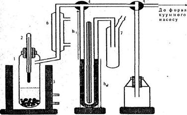 Рис. 1. Схема експериментального пристрою для вимірювання тиску насиченої пари: 1 - реактор; 2 - термометр; 3 - термостат; 4, 5 -крани; 6 - холодильник; 7 – пастка. 8. Отримавши рівняння прямої за МНК, знайти виправлені значення lnP’пари, що відповідають заданим значенням T, нанести на графік та провести пряму. 9. За рівнянням (3) знайти температуру кипіння досліджуваної рідини за нормального атмосферного тиску, отриману величину порівняти з довідковою. 10. Оцінити похибку вимірювань. Інтегрування диференціального рівняння Клаузіуса -Клапейрона у вузькому температурному інтервалі приводить до рівняння