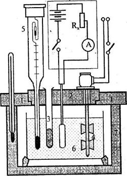 Електричну схема нагрівача для визначення теплоємності калориметричної системи наведено на рис.2. Опір нагрівача (І) підбирають таким, щоб швидкість нагрівання не перевищувала 0,5 - 1,0°С протягом 3-4 хв. Джерелом електроенергії може бути як акумуляторна батарея, так і випрямляч (2) напругою 4-6 В. Силу струму регулюють реостатом (5), а вимірюють амперметром (3), Для вимірювання напруги на затискачах нагрівача використовують вольтметр (4). Перемикачем (6) вмикають нагрівач і одночасно включають секундомір. Виконання калориметричного досліду розпочинають з підготовки калориметра до роботи. У дюар (або стакан) заливають 400-500 мл води, температура якої близька або дорівнює кімнатній. Для того, щоб утворились розчини однакової концентрації, зважують дві порції по 10 г ретельно розтертого в порошок CuSO4·5H2O з точністю не вище 10-3.