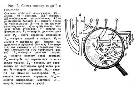 Витрати тепла на фотосинтез Р становлять дуже малу частку радіаційного балансу – в середньому 1,3%. Проте її роль у геосистемі надзвичайно велика, бо власне вона зумовлює продуційний та інші важливі біотичні процеси. При фотосинтезі використовується фотосинтетично активна радіація ФАР, частка якої становить близько 45% сумарної (40% прямої та 62% розсіяної). Рослинний покрив поглинає 90% світлової енергії ФАР, проте переважна його частина йде на транспірацію та регулювання температури рослин і лише 0,5 – 1,5 % на фотосинтез. Ефективність фотосинтезу визначається гідротермічними умовами геосистем. Найбільша вона за максимальної теплозабезпеченості при оптимальному співвідношенні тепла й вологи. Такі природні умови характерні для екваторіальних лісів, де ефективність фотосинтезу досягає 4,5% ФАР, або 1,5% сумарної радіації. У штучних умовах можна довести ефективність фотосинтезу до максимальної – 34% ФАР. Енергія Р, що пішла на забезпечення реакції фотосинтезу, витрачається на дихання рослин Рb (близько 50%), а решта становить чисту первинну продукцію Ра - накопичення енергії в рослинній біомасі. З цієї енергії деяка її частина Рm з відмиранням рослин або їх окремих органів переходить до мортмаси, частина Р і залишається у фітомасі й зумовлює її щорічний приріст, частина Z разом з фітомасою, що поїдається тваринами, переходить до наступного трофічного рівня. Співвідношення мі цими статтями енергетичних витрат залежить від багатьох факторів. З них особливо важливі видовий склад рослинного угруповання, вікова структура популяцій, їх екологічний стан, характер господарського використання, чисельність та популяційний склад тваринного населення біоценозу. Енергія Z, що надходить з фітомасою до травоїдних тварин, частково йде на потреби самих цих тварин, а частково переходить до тварин-хижахів. Ці тварини, в свою чергу, поїдаються хижаками вищих порядків, а відтак передають частину енергії і їм. Так формується трофічна структура геосистеми. В екології при її дослідженні прийнято виділяти трофічні рівні – сукупність організмів, які отримують енергію від рослин через однакове число організмів-посередників. Самі зелені рослини формують перший трофічний рівень – рівень продуцентів (або автотрофів); травоїдні тварини (зайці, олені тощо) – другий рівень (первинних консументів, або гетеротрофів 1-го порядку); хижаки – третій (рівень вторинних консументів, або гетеротрофів 3-го порядку) і так далі. Оскільки потік енергії від одного трофічного рівня до вищого супроводжується її втратами (до 95%), кількість трофічних рівнів не може бути необмеженою і лише в енергетично багатих екосистемах може досягати 5-6 (екваторіальні ліси, морські планктонові екосистеми). Потік енергії Z від одного організму до іншого супроводжується її втратами. Їжа як рослинного, так і тваринного походження повністю організмом не засвоюється. Частина її виводиться з організму у вигляді екскрементів Z e, частина Zb витрачається на дихання тварин, а решта енергії Zi може йти на синтез нової біомаси (точніше – зоомаси) в результаті росту організму та розмноження. З цієї енергії Zm втрачається популяцією внаслідок загибелі її особин і далі включається в енергетичні потоки переробки мортмаси, а решта енергії Zz переходить до організмів –консументів вищих рівнів, де структура енер