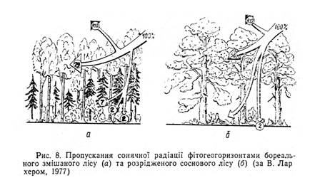 Загальна схема Потік і трансформація енергії Першою моделлю потоків енергії в екосостемі була схема трофічних шляхів для прерії (В.Шелфолд, 1913). Кількісно характеристику потоку енергії по всій трофічній структурі вперше виконав Р.Ліндеман (1942).Згодом подібні дослідження для біотичних елементів виконали Г.Одум (1957,1960), А.Макфедьєн (1963), П.Дювіньйо (1964), а для абіотичних дослідження радіаційного балансу різних типів ландшафтів проводили М.І.Будико, Ю.Р.Раунер і ін. Основним джерелом енергії для багатьох процесів у геосистемі є сонячна. Порівняно з нею енергії до геосистеми від інших джерел надходить дуже мало (теплової енергії з надр Землі – 0,04% сумарної сонячної радіації, тектонічних рухів – 0,0005%). При цьому сонячна енергія і використовується в геосистемі найбільш ефективно: вона здатна трансформуватися в інші види енергії (теплову, хімічну, механічну), завдяки їй відбувається продукування біомаси, вологообмін, циркуляція повітряних мас тощо. Загальну схему потоку і трансформації сонячної енергії в геосистемі наведено на рис.7. На верхню межу атмосфери надходить 2 кал/см2 ·хв сонячної енергії. Проходячи крізь атмосферу, вона послаблюється атмосферними газами та пилом. При цьому ступінь послаблення залежить від довжини хвилі (частоти) світла. З екологічної точки зору, найбільш важливими обставинами диференційованого послаблення випромінювання є дві: 1) ультрафіолетове випромінювання (найбільш небезпечне для протоплазми) практично не проходить крізь озоновий шар, що й забезпечує можливість життя на планеті; 2) менше всього послаблюється видиме світло, що необхідне для фотосинтезу, а тому він може відбуватись і в похмурі дні. Сумарна радіація (R на рис.7) складається з прямої (RI) та розсіяної (RS). Співвідношення між ними залежить від географічного положення геосистеми, хмарності та інших кліматичних факторів. Це співвідношення визначає ряд похідних ландшафтно-екологічних факторів, зокрема – експозиційний. Чим більша частка прямої радіації в сумарній, тим більше значення має фактор експозиції схилу. Частина сумарної радіації, досягаючи геосистеми, витрачається на ефективне випромінювання в атмосферу RE та відбивається поверхнею геосистеми (відбита радіація RA). Величина останнього потоку визначається характером поверхні геосистеми (її альбедо) і суттєво змінюється в різних умовах: у дібровах – 0,14 – 0,17, степах – 0,20 – 0,23, на солончаках – 0,35, засніженій поверхні – до 0,95. Альбедо слід розглядати як інтегральний параметр вертикальної структури геосистеми, який визначає потік відбитої радіації з неї як з деякого нерозчленованого цілого. Насправді ж потік сонячної радіації, проходячи від верхньої межі геосистеми до поверхні грунту, значно змінює свою інтенсивність, спектральний склад та інші характеристики. Ці зміни визначаються геогоризонтальною вертикальною структурою геосистеми, особливо потужністю та часткою геомас листя в окремих аерофітогоризонтах (рис.8). Ефективне випромінювання та відбита радіація втрачаються для геосистеми, а та частина сумарної радіації, що безпосередньо йде на різні процеси в геосистемі, називається її радіаційним балансом RB. Більша його частина витрачається на випаровування (фізичне Е і трансформацію Т) та на