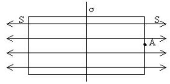 На рисунку заряджена площина спроектована перпендикулярно до площини листка. Замкнена поверхня є циліндром із площею торців S. Потік вектора напруженості в даному випадку слід розрахувати лише крізь торці. Лінії напруженості електричного поля паралельні до бокової поверхні, а тому потоку не створюють, тобто