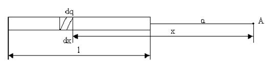 На стрижні виділимо безмежно малу ділянку, довжиною dx із зарядом dq, для якої потенціал в точці А можна записати, як для точкового заряду, а саме dj =
