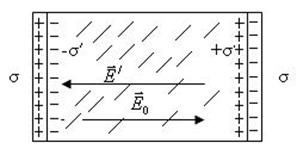 Розглянемо діелектрик, який розміщено між пластинами конденсатора, площа яких досить велика порівняно з відстанню між пластинами. Лише при цій умові електричне поле в центральній частині конденсатора можна вважати однорідним (рис. 9.7). З рисунка видно, що електричне поле
