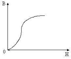 14.4. Феромагнетики та їх основні властивості Поряд із слабомагнітними речовинами діамагнетиками і парамагнетиками, існують сильно магнітні речовини - феромагнетики. До феромагнетиків відносяться речовини, які мають від природи спонтанну намагніченість, тобто зберігають намагніченість при відсутності зовнішнього магнітного поля. У діамагнетиках вектор намагніченості j лінійно змінюється із зростанням напруженості зовнішнього магнітного поля. У феромагнетиках при зростанні Н вектор j росте до насичення, а потім залишається постійним. Магнітна проникність m у феромагнетиках може досягати значень, які вимірюються сотнями тисяч одиниць. Магнітна проникність і магнітна індукція у феромагнетиках залежить від величини напруженості зовнішнього магнітного поля. (рис.14.6)