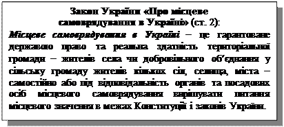 Такий підхід до тлумачення місцевого самоврядування максимально наближає законодавчі норми до вимог Європейської хартії місцевого самоврядування. Якщо у Конституції місцеве самоврядування представлено як право територіальної громади самостійно вирішувати питання місцевого значення. То у законі від 21.05.1997 р. підкреслена гарантія з боку держави цього права. Місцеве самоврядування, згідно закону, виступає вже не тільки як гарантоване державою право, але і реальна здатність територіальної громади самостійно або під відповідальність органів місцевого самоврядування та їх посадових осіб вирішувати питання місцевого значення. Законом України «Про місцеве самоврядування в Україні» встановлені наступні принципи, на основі яких здійснюється функціонування інституту місцевого самоврядування в Україні: Принципи місцевого самоврядування в Україні: ¨ народовладдя; ¨ законність; ¨ гласність; ¨ колегіальність; ¨ поєднання місцевих і державних інтересів; ¨ виборність; ¨ правова, організаційна та матеріально-фінансова самостійність в межах повноважень; ¨ підзвітність та відповідальність перед територіальними громадами їх органів та посадових осіб; ¨ державна підтримка та гарантії місцевого самоврядування; ¨ судовий захист прав місцевого самоврядування. Органи місцевого самоврядування є юридичними особами, вони наділяються власними повноваженнями, в межах яких діють самостійно і несуть відповідальність за свою діяльність. Крім того, органам місцевого самоврядування можуть надаватися окремі повноваження органів виконавчої влади, у здійсненні яких вони є підконтрольними відповідним органам виконавчої влади. Вирішальне значення для забезпечення функціонування місцевого самоврядування має матеріально-фінансова основа їхньої діяльності, яка включає: рухоме і нерухоме майно; доходи місцевих бюджетів; позабюджетні цільові (в тому числі валютні) та інші кошти; землю, природні ресурси, що знаходяться у комунальній власності територіальних громад, сіл, селищ, міст, районів у містах, а також об’єкти їхньої спільної власності, що перебувають в управлінні районних і обласних рад.
