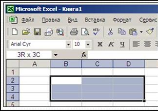 Рисунок 2.2 – Діапазон (блок) чарунок в MS Excel Невід'ємним елементом робочого поля таблиці є курсор. В електронних таблицях термін “курсор” використовується в наступних випадках (див. таблицю 2.1): · курсор - жирна рамка навколо поточної чарунки, переміщається за допомогою клавіш управління курсором; · текстовий курсор - миготлива (або не миготлива) риска, що відзначає положення поточного символу при редагуванні вмісту чарунки. Таблиця 2.1 - Типи покажчиків миші при роботі з таблицею MS Excel