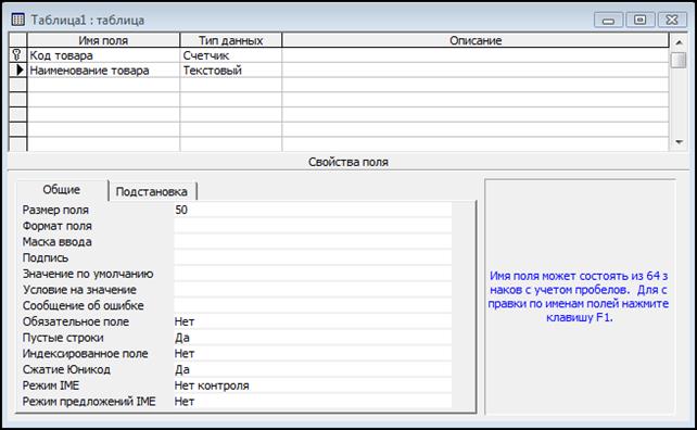 Рисунок 3.3 – Відображення загальних властивостей відміченого поля Тепер визначимо докладно типи даних Access, тому що від вибраного типу даних залежать можливі значення властивості розмір поля. · Текстовий (Text) — символьні або числові дані, що не вимагають обчислень. Розмір текстового поля даного типу може містити до 255 символів. За допомогою властивості „Розмір поля” вказується максимальна кількість символів, які можуть бути введені в дане поле. При необхідності ввести рядок більшого розміру, ніж вказано в даній властивості, треба значення властивості змінити, оскільки місце під додаткові символи не резервується. Незалежно від довжини текстового поля воно зберігається в базі даних Access в записі змінної довжини. Access не займає пам'ять під невживану частину текстового поля в записі, що зменшує загальний розмір бази даних. · Числовий (Числовой, Number) — числовий тип застосовується для зберігання числових даних, що використовуються в математичних розрахунках. Має багато підтипів. Від вибору підтипу (розміру) даних числового типу залежить точність обчислень. Дані цього типу можуть міститися в 1, 2, 4, 8 або 16 байтах. Звичайно за умовчанням використовується підтип „Довге ціле” (Длинное целое, Longlnteger), який займає 4 байти і є числом в межах від -2 147 483 648 до +2 147 483 647. Але, окрім цього підтипу, можна вказати: - „Байт” (Байт, Byte) — 1 байт, від 0 до 255; - „Ціле” (Целое, Integer) — 2 байти, від -32 768 до 32 767; - „Одинарне з плаваючою точкою” (Одинарное с плавающей точкой, Single) — 4 байти, від -3,4х1038 до 3,4х1038 с точностью до 7 знаков; - „Подвійне з плаваючою точкою” (Двойное с плавающей точкой, Double) — 8 байтів, від ~1,797х10308 до 1,797х10308 з точністю до 15 знаків; - „Десяткове” (Десятичное, или Действительное, Decimal) — 12 байтів, від —1038 - 1 до 1038 — 1 (при роботі з проектами, які зберігаються у файлах з розширенням adp) і від —1028 — 1 до 1028 — 1 (для файлів з розширенням mdb) з точністю до 28 знаків; - „Код реплікації” (Код репликации, Replication ID) — 16 байтів. Глобальний унікальний ідентифікатор (Globally unique identifier, GUID), займає 16 байт. Поля такого типу використовуються в Access для створення системних унікальних ідентифікаторів реплік, наборів реплік, таблиць, записів і інших об'єктів при реплікації баз даних. · Лічильник (Счетчик, AutoNumber) — поле містить унікальний номер, визначуваний Microsoft Access автоматично для кожного нового запису або випадковим чином, або шляхом збільшення попереднього значення на 1. Значення полів типу лічильника обновляти не можна. Максимальне число записів в таблиці з полем лічильника не повинне перевищувати двох мільярдів. Для поля з типом даних Лічильник можна задати розміри: - Довге ціле — 4 байта; - Код реплікації — 16 байт. · Дата/час (Дата/Время, Date/Time) — тип для представлення дати і часу. Дозволяє вводити дати з 100 по 9999 рік. Розмір поля — 8 байтів. Дати і час зберігаються в спеціальному фіксованому числовому форматі. Дата є цілою частиною значення поля типа Дата/час, а час — його дробовою частиною. Access надає великий вибір форматів відображення дати і часу. · Грошовий (Денежный, Currency) — тип даних, призначений для зберігання даних, точність представлення яких коливається від 1 до 4 десяткових знаків. Ціла частина даного типу може містити до 15 десяткових знаків. · Логічний (Yes/No) — логічне поле, яке може містити тільки два значення, що інтерпретуються як „Да/Нет”, „Истина/Ложь”, Включено/Викл