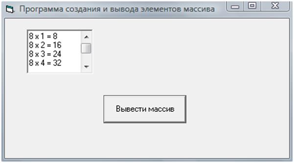 End Sub Next x Next x Текст процедури виведення елементів масиву: Private Sub Command1_Click() For x = 1 To 10 txt_output.Text = txt_output.Text & "8 x " & Number(x, 1) & " = " & Number(x, 2) & vbCrLf Результат роботи програми зображений на рис. 4.9.