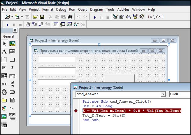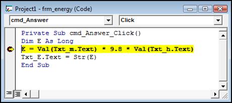 Рисунок 4.17 – Точка останову в коді програми (Toggle Breakpoint) Точки останову можна помістити в будь-якому рядку коду, окрім рядків коментарів або порожніх рядків. Видалити всі точки останову в усьому проекті можна за допомогою команди Clear All Breakpoints меню Debug. Точки останову призначені для примусової зупинки програми в потрібному місці і переходу в режим відладки. В результаті стають доступними всі засоби відладки. В режимі відладки VB особливим чином виділяє рядок, який повинен виконуватися наступній. Сам рядок виділяється жовтим кольором, а на смузі індикатора поряд з нею з'являється жовта стрілка. Якщо виконання програми переривається в точці останову, то обидва виділення комбінуються (див. рис. 4.18).