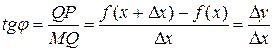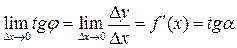 Читається так: похідна в даній точці х дорівнює тангенсові кута, утвореного дотичною до кривої в точці М(х,у) з додатнім напрямом осі Ох, тобто дорівнює кутовому коефіцієнту цієї дотичної (геометричний зміст похідної). Знаючи похідну функції Нехай функція