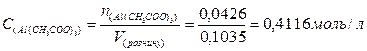 Задача 2. При запаленнях шкіри і слизових оболонок використовують розчин ацетату алюмінію, який одержують розчиненням 8,7 г солі в 100 мл води. Визначити молярну концентрацію ацетату алюмінію у такому розчині, якщо густина розчину 1,05 г/см3. РОЗВ’ЯЗАННЯ 1) Розраховуємо кількість речовини ацетату алюмінію: