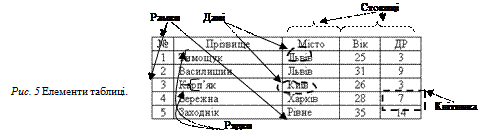 Такі дані як, наприклад, списки працівників фірм з анкетними даними, інформацію про друзів чи дані виробничого характеру варто наводити у вигляді таблиць. Таблиці призначені для наочного подання інформації. Елементами таблиці є клітинки (комірки), рядки, стовпці, рамки і дані, які є в клітинках (див. рис. 5). Таблиці створюють засобами пункту Таблица основного меню. Є три способи створення таблиць за допомогою таких команд: ¨ Вставити таблицю; ¨ Намалювати таблицю; ¨ Перетворити текст в таблицю. Розглянемо перший спосіб. Внаслідок виконання команди Таблица Þ Вставить Þ Таблицу... отримаємо Діалогове вікно, де треба задати кількість стовпців і рядків майбутньої таблиці. Після натискання на кнопку ОК порожня таблиця розташується в документі там, де стояв текстовий курсор. Вводять у таблицю дані і відображають рамки.