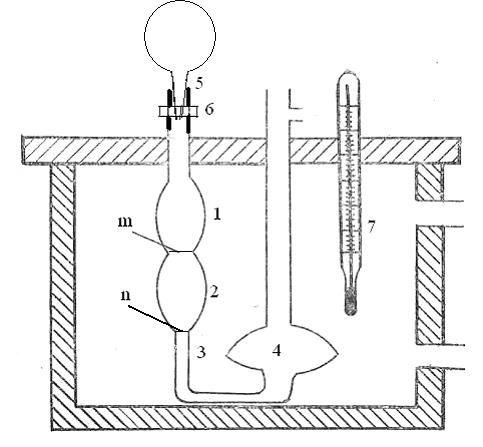 Віскозиметр, який використовується у цьому методі визначення η, являє собою U-подібну скляну трубку, одне коліно якої має розширення (1) і (2) і капіляр (3) (рис.4.2). Друге коліно – широка трубка з резервуаром (4). При вимірюваннях віскозиметр розміщують в посудині з водою, яка слугує термостатом.