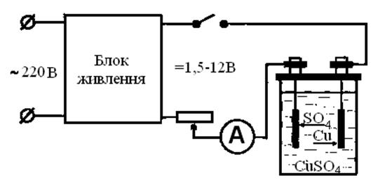 На рисунку зображена установка для виконання роботи. В її склад входять: електролітична ванна, амперметр, вимикач, реостат, блок живлення.