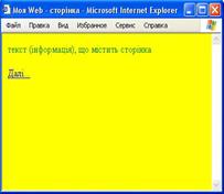 Рис. 10 Завдання: розробити елементарну Web-сторінку, що містить гіперпосилання на іншу сторінку, фон, рисунок та вашу інформацію (рис.10).