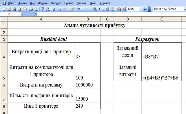 Завдання: 1) Знайти загальний дохід і загальні витрати, а потім прибуток від продажу принтерів. 2) Варіюючи значення кількості проданих принтерів від 10000 до 20000 штук з кроком 2000 і, використовуючи таблицю підстановки, отримати значення прибутку. 3) На окремому аркуші створити точкову діаграму аналізу чутливості прибутку до кількості проданих принтерів.