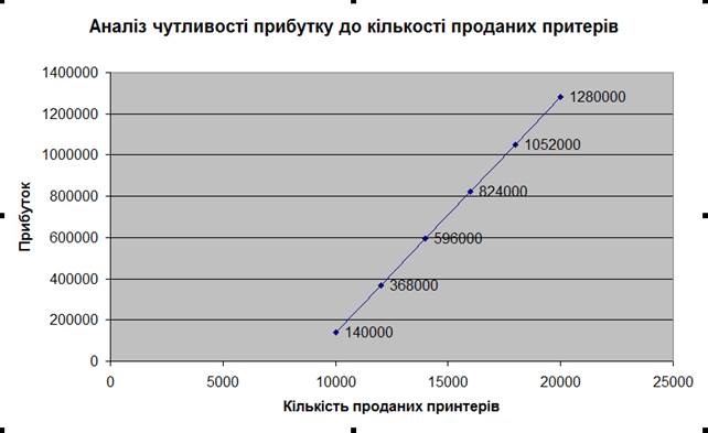 5) На окремому листі створити точкову діаграму аналізу чутливості прибутку до кількості проданих принтерів (дивися рисунок 1.10).