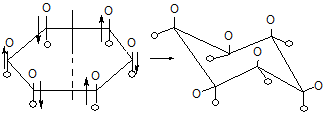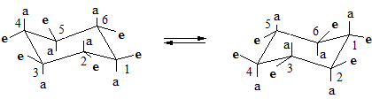Молекула циклогексану може приймати дві кріслоподібні конформації. При переході від однієї конформації до другої атоми Гідрогену стають екваторіальними або аксіальними. Енергія переходу невелика і такі переходи відбуваються у звичайних умовах (20°С):